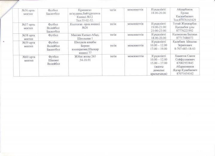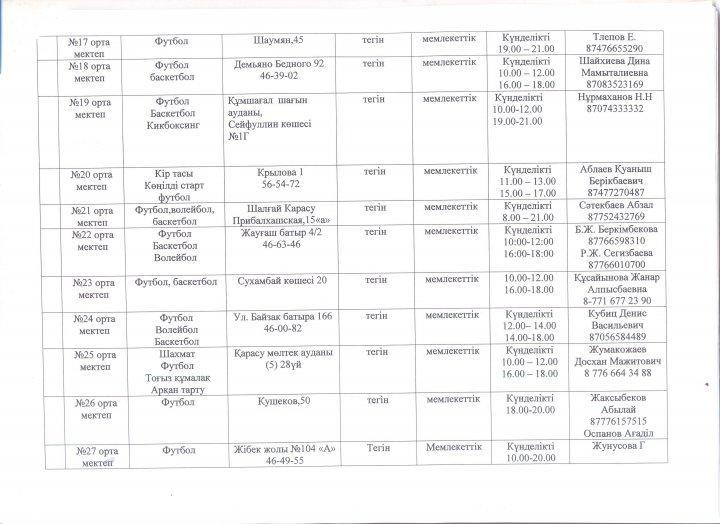 17 маусым 2019 0 1 2 3 4 5 Спорт нысанының тұрғындарға қолжетілімділігі бойынша Білім беру мекемелерінде орналасқан спорт алаңшаларының тұрғындарға қол жетімді болуын қамтамассыз ету мақсатында мектебімізде маусым-тамыз айларына арналған жұмыс кестесі
