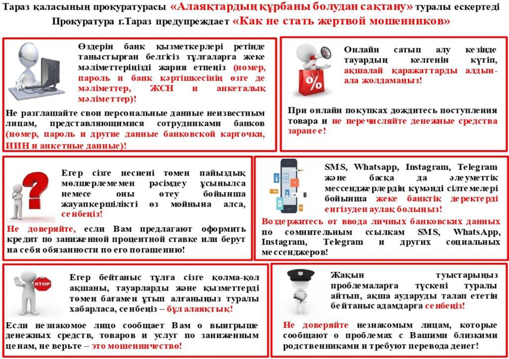 19 қаңтар 2024 0 1 2 3 4 5 Тараз қаласының прокуратурасы "Алаяқтардың құрбаны болудан сақтану" туралы ескертеді
