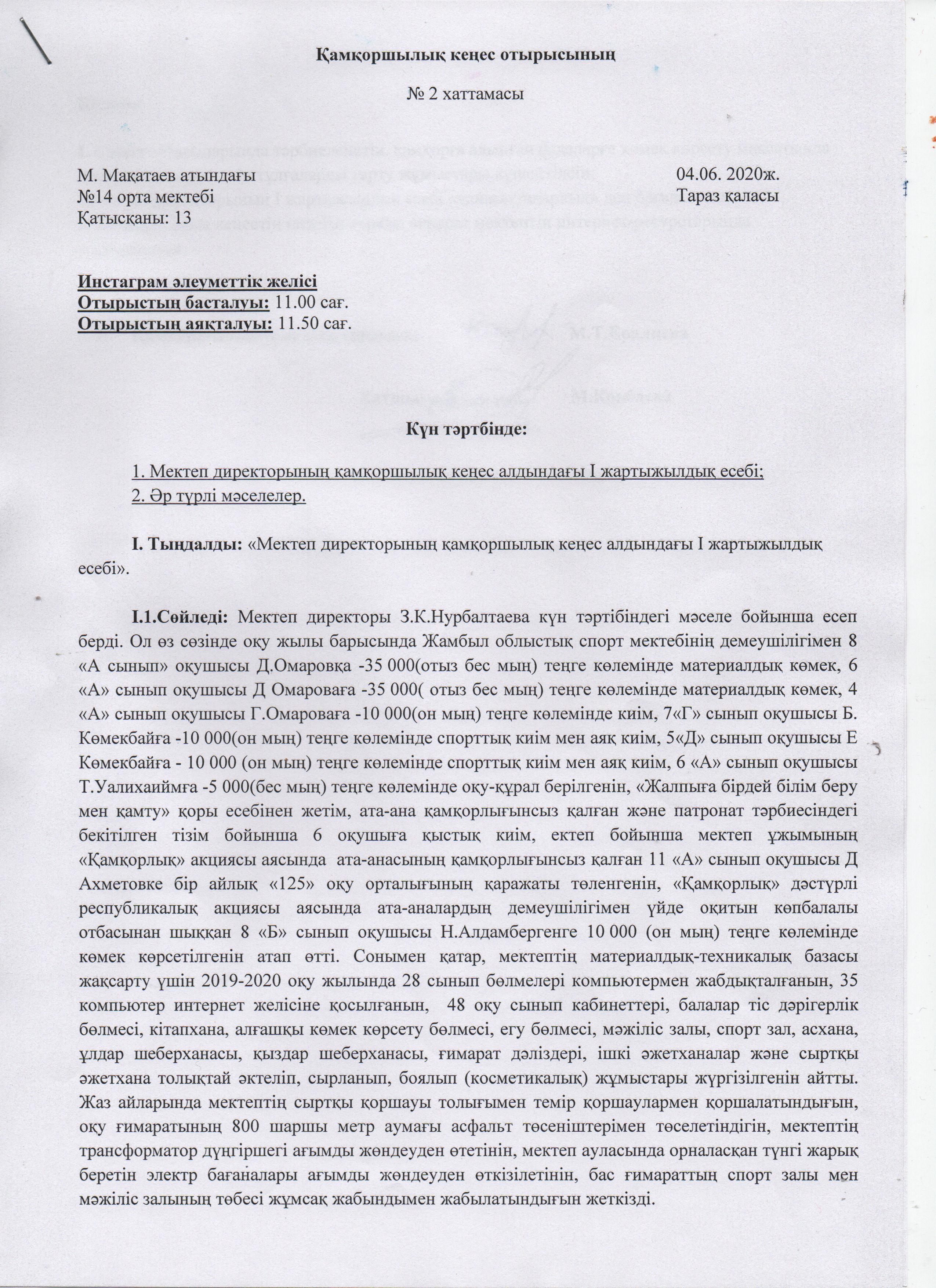 Қамқоршылық кеңес отырысының хаттамасы » СШ №14