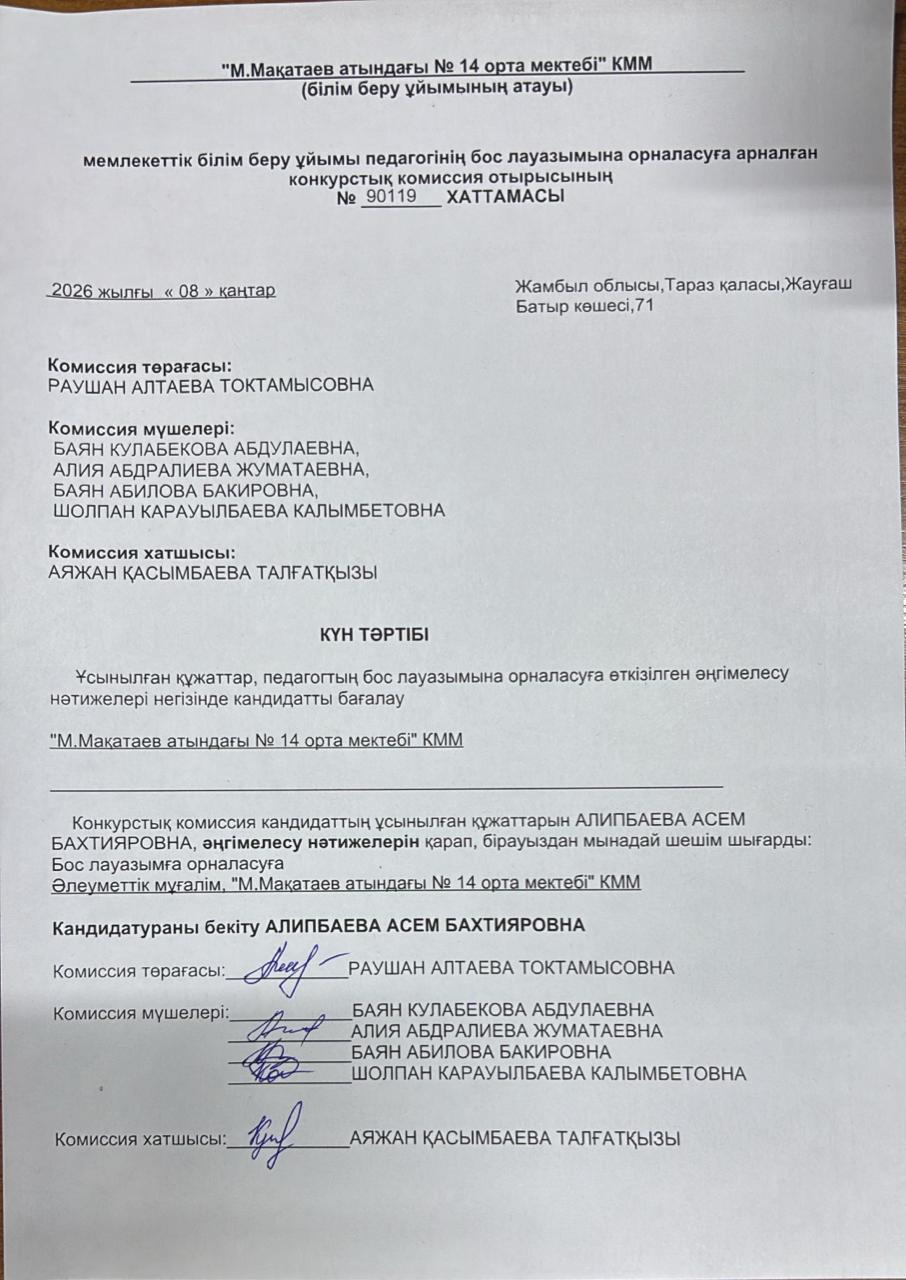 Конкурспен қабылданған әлеуметтік педагог хаттамасы » СШ №14